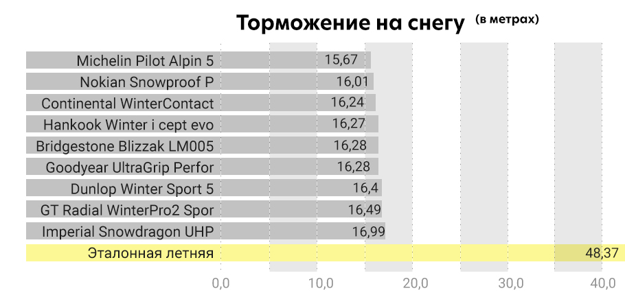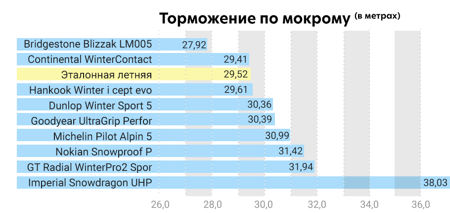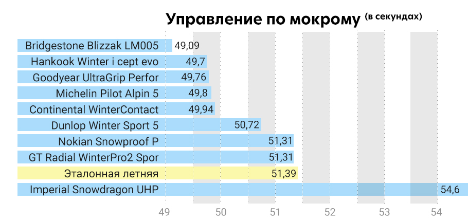 Что касается летней модели, то она справилась с прохождением забега быстрее остальных, была комфортной, самой показательной в управлении, с короткой тормозной дистанцией - все, что можно было ожидать от летней резины, но при тестовой температуре 3 C у нее не было огромного преимущества. Летние модели обычно проходят такие испытания с наилучшими показателями при любой температуре.